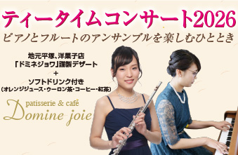 地元平塚、洋菓子の名店「ドミネジョワ」謹製デザートとソフトドリンク付きコンサート。ピアノとフルートのアンサンブルで午後の心地よいひとときをお過ごしください。